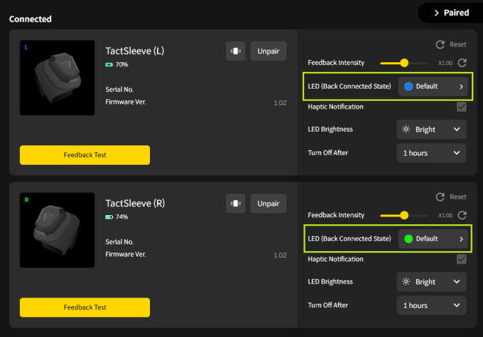 You can customize the LED indicator color of your TactSleeve using the bHaptics Player for PC. If you do not see the LED Color option, please make sure you are using the latest version of the bHaptics Player and update if necessary.