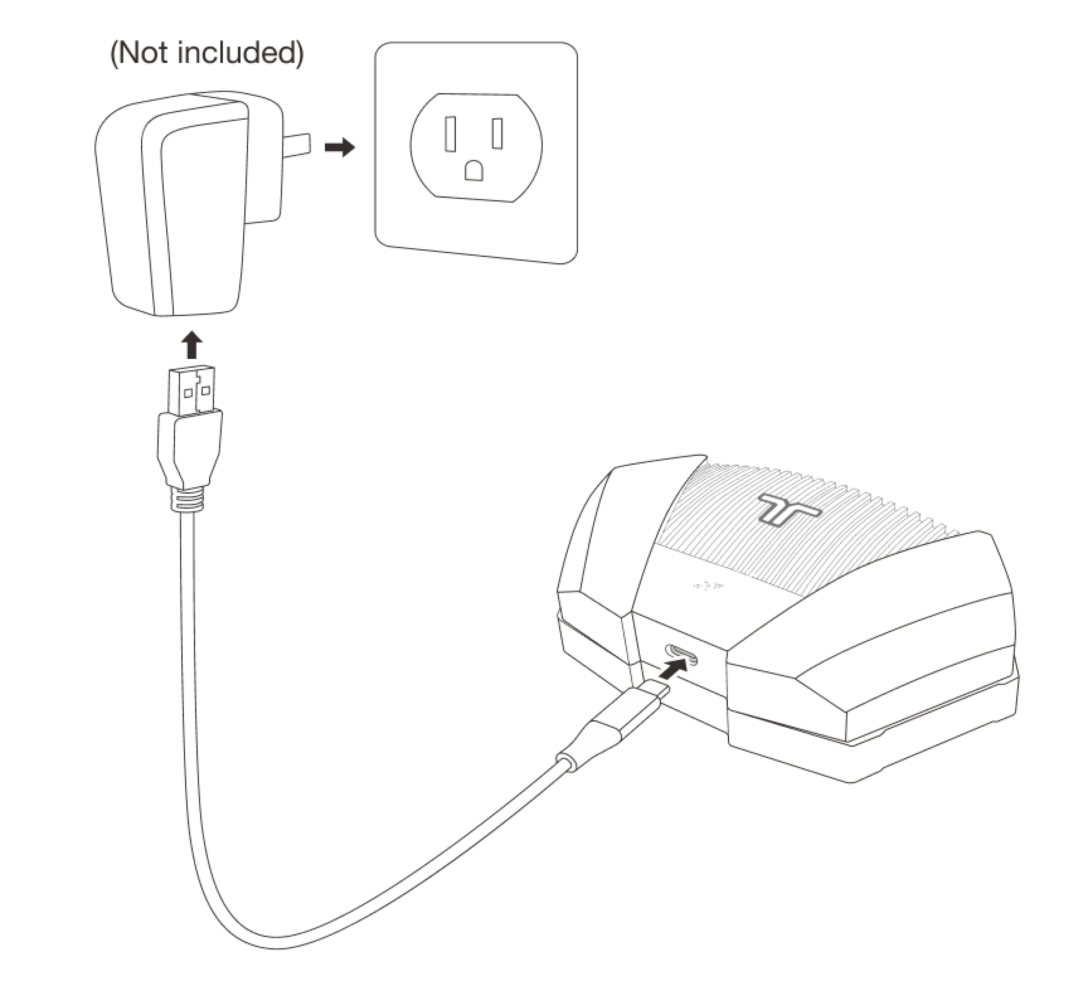 The TactSuit Air does not include a power adapter. You can charge it using any AC adapter that meets your region’s safety standards, such as UL-certified (U.S.) or CE-certified (Europe) adapters. You can also charge it using a USB port on your PC or laptop.