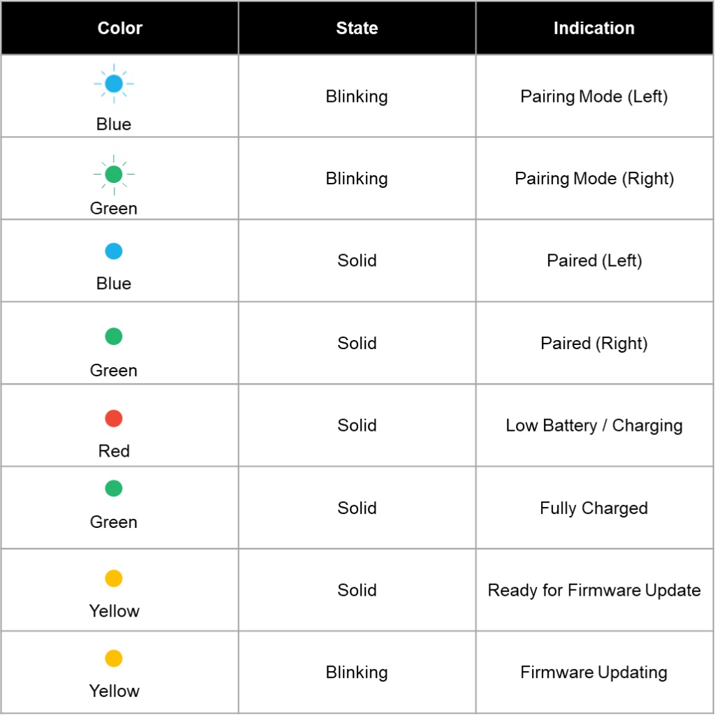 The LED indicator on the Main Controller shows the current status of your TactGlove DK2. Each color represents a specific status or function, helping you quickly understand the device’s state.