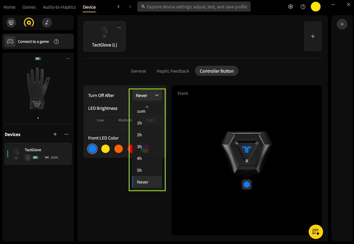 You can manually power off your TactGlove by pressing the power button. Additionally, the automatic power-off feature lets the device turn off after a period of inactivity, helping to conserve energy and extend battery life.