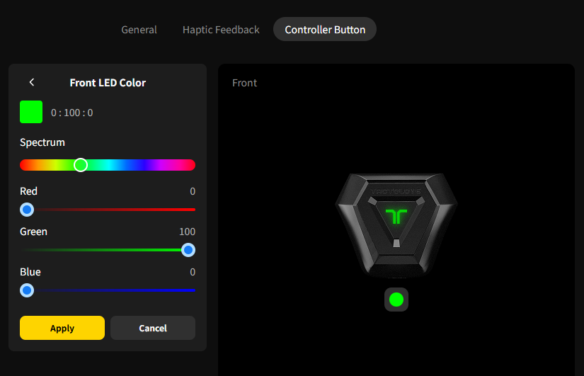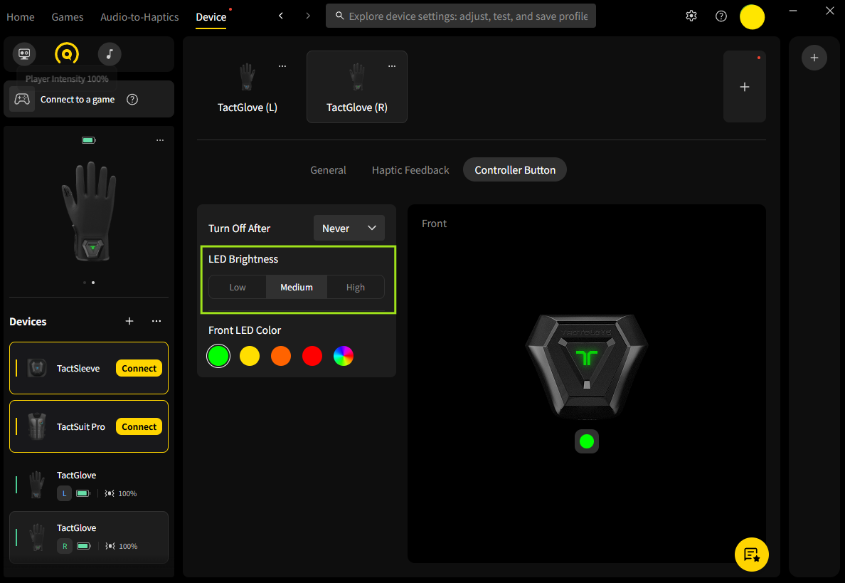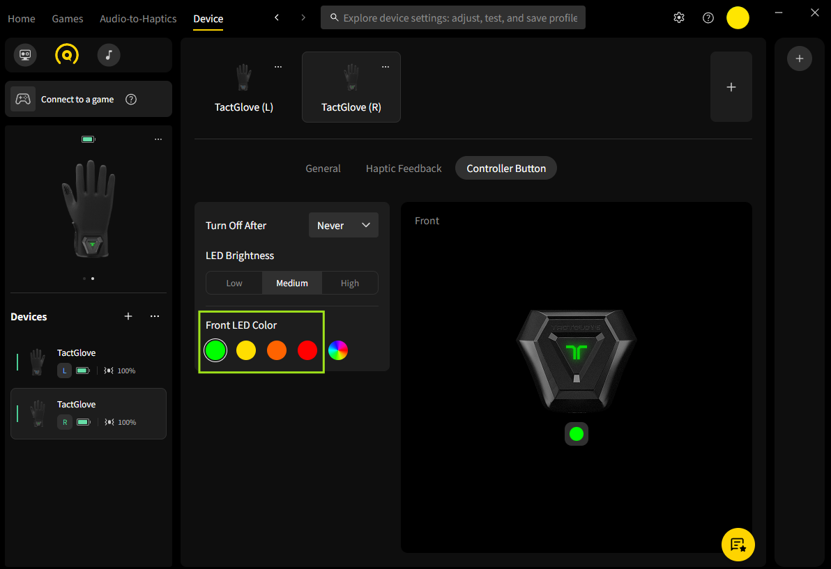 You can customize the LED indicator color of your TactGlove using the bHaptics Player for PC. This feature lets you personalize your device by changing the LED colors independently.
