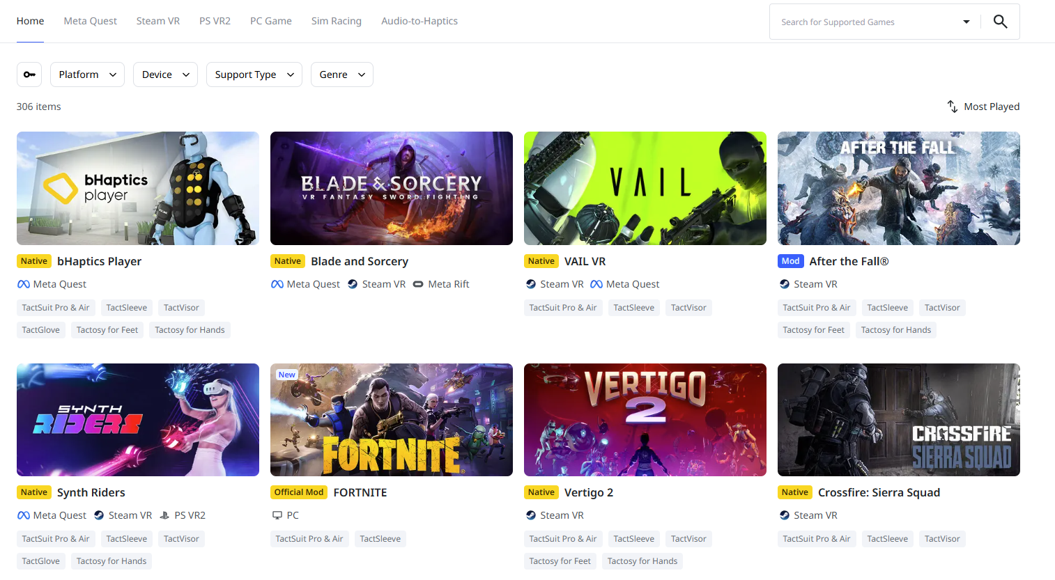 You can browse the complete list of Natively Supported Content in the Games page on the bHaptics official website: bHaptics Games