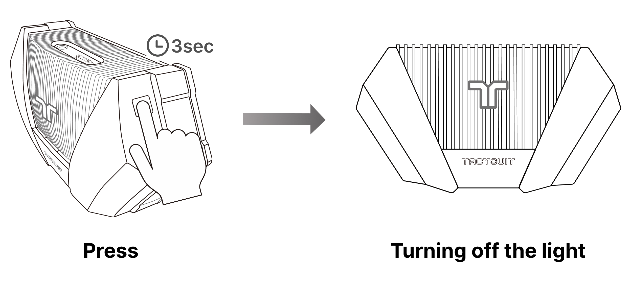 To power on the TactSuit, press and hold the power button on either the Front Controller or the Back Controller for 2 seconds. The suit will vibrate briefly, and the LED indicator will blink blue to confirm that it has entered Bluetooth pairing mode.