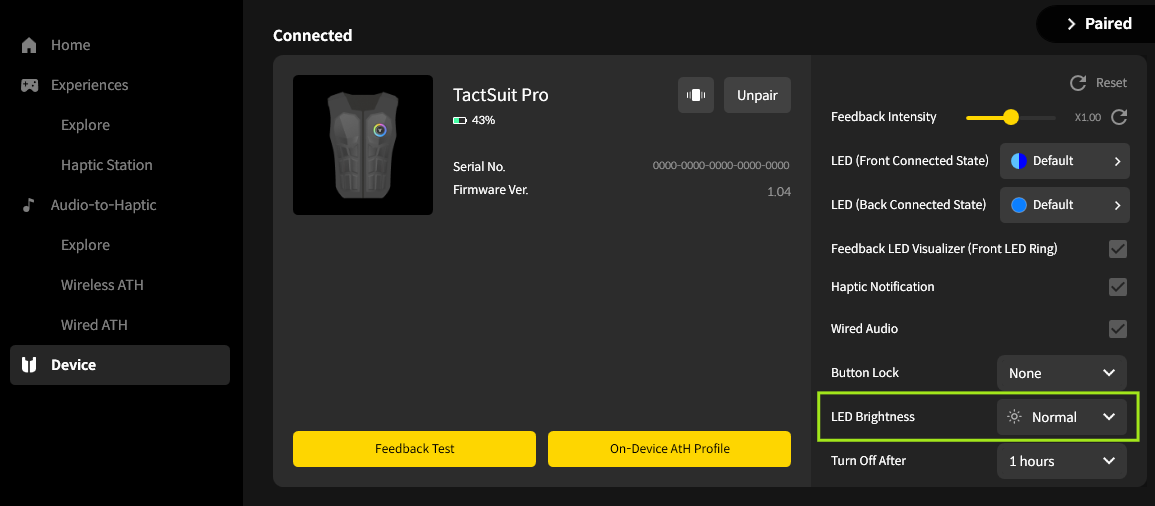The LED indicator on the Front Controller of the TactSuit Pro shows the device status using different colors. You can adjust the brightness of this LED to match your preference. The brightness can be set to Low, Medium, or High.