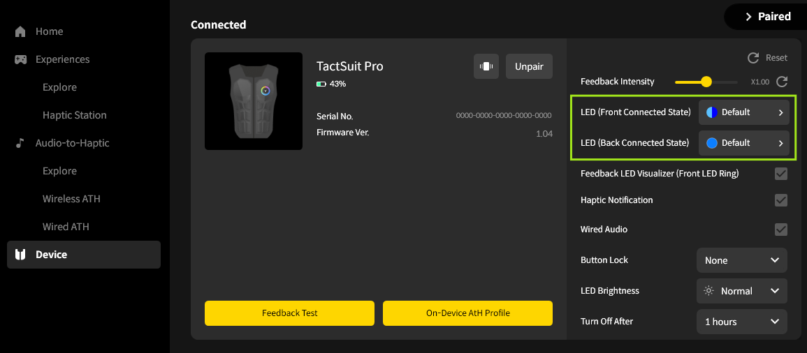 You can customize the LED indicator color of your TactSuit Pro using the bHaptics Player for PC. This feature lets you personalize your device by changing the front and back LED colors independently. If you do not see the LED Color option, please make sure you are using the latest version of the bHaptics Player and update if necessary.