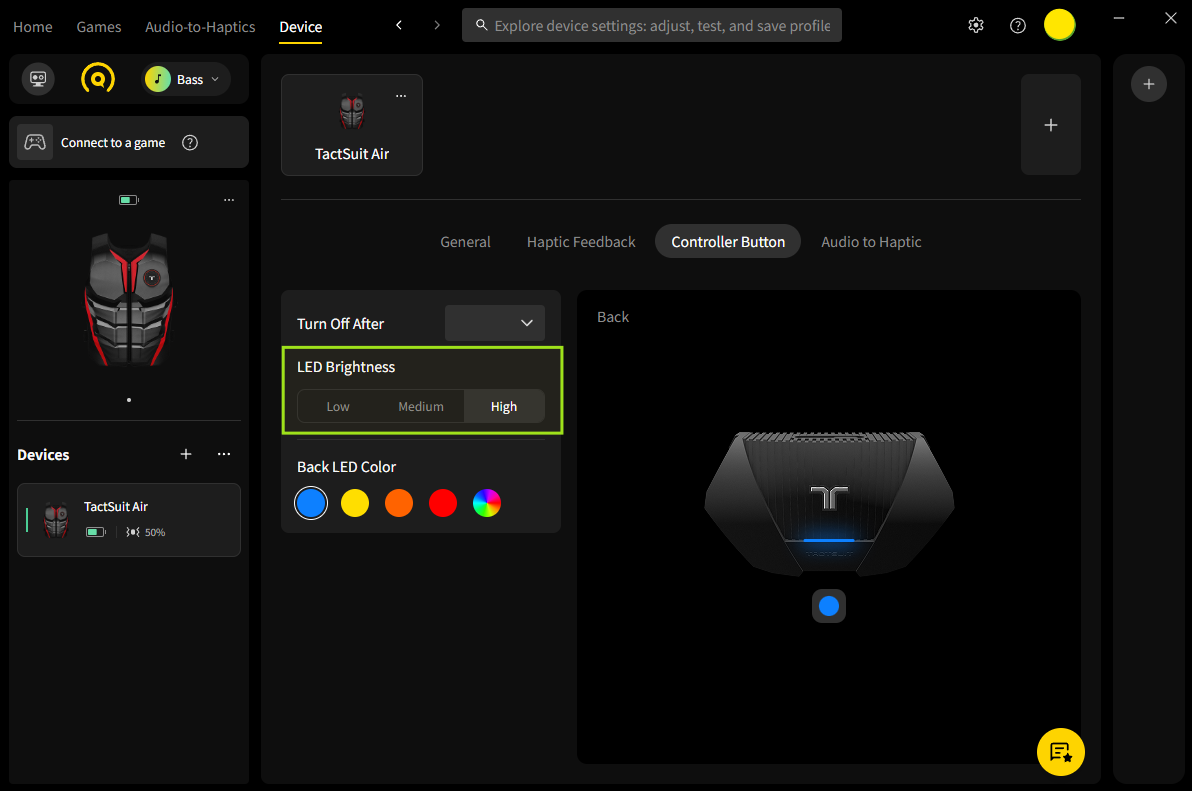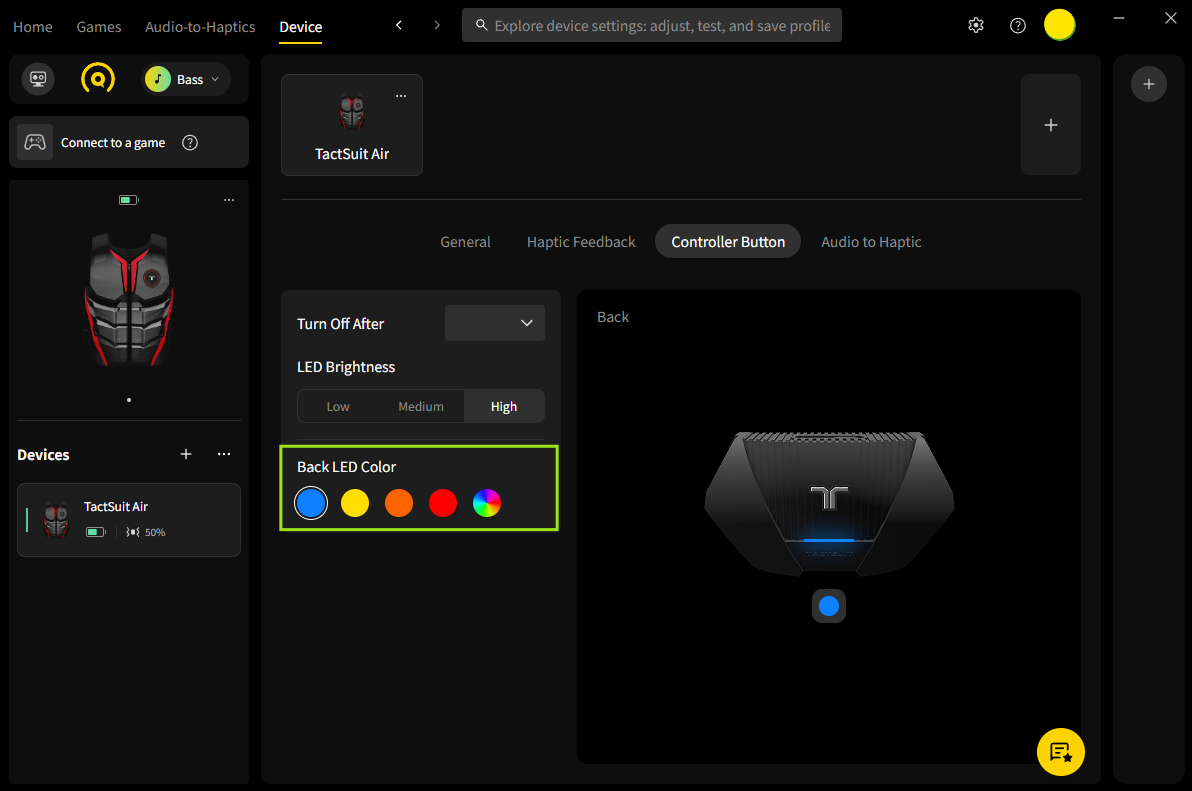 You can adjust the LED color and brightness of your TactSuit Air using the bHaptics Player for PC. This lets you personalize the back LED indicator to match your preferences.