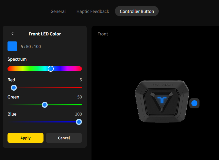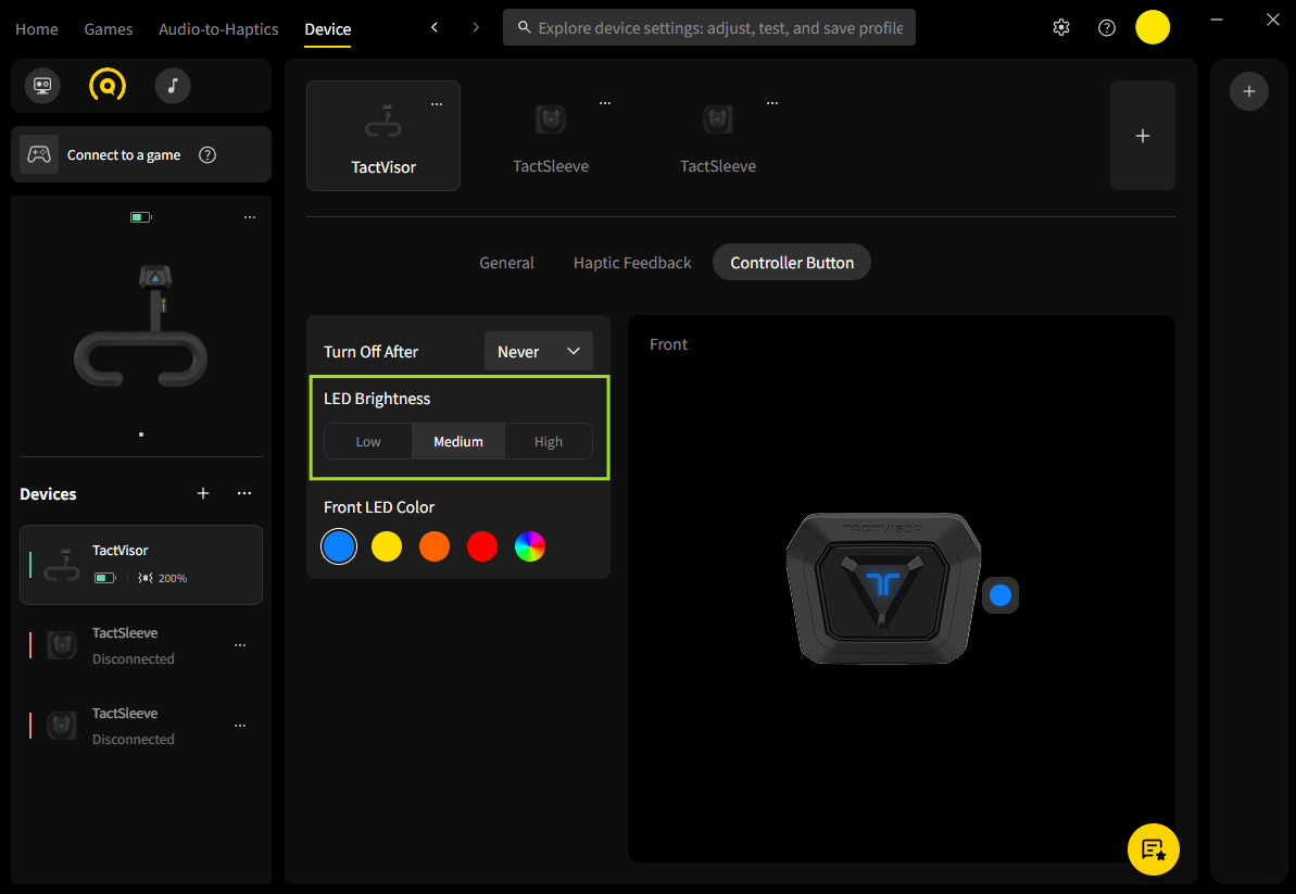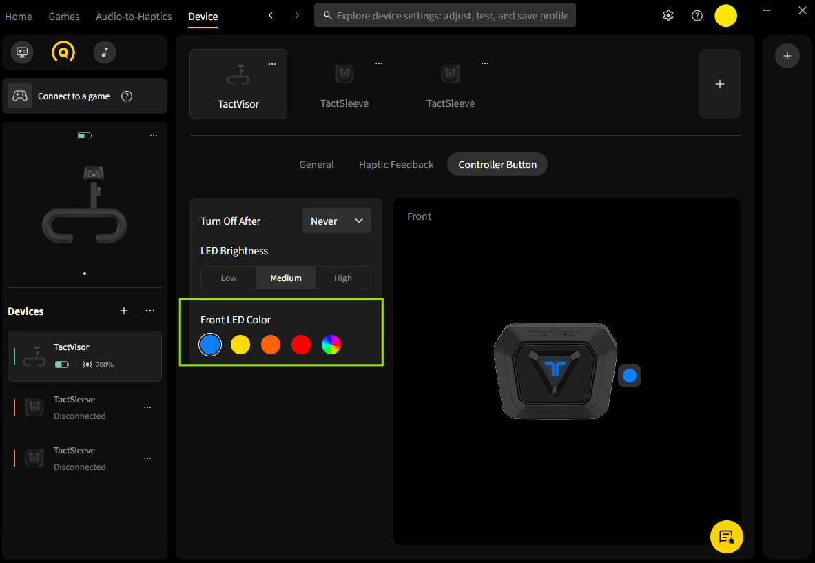 You can customize the LED indicator color of your TactVisor using the bHaptics Player for PC. This feature lets you personalize your device by changing the front and back LED colors independently.