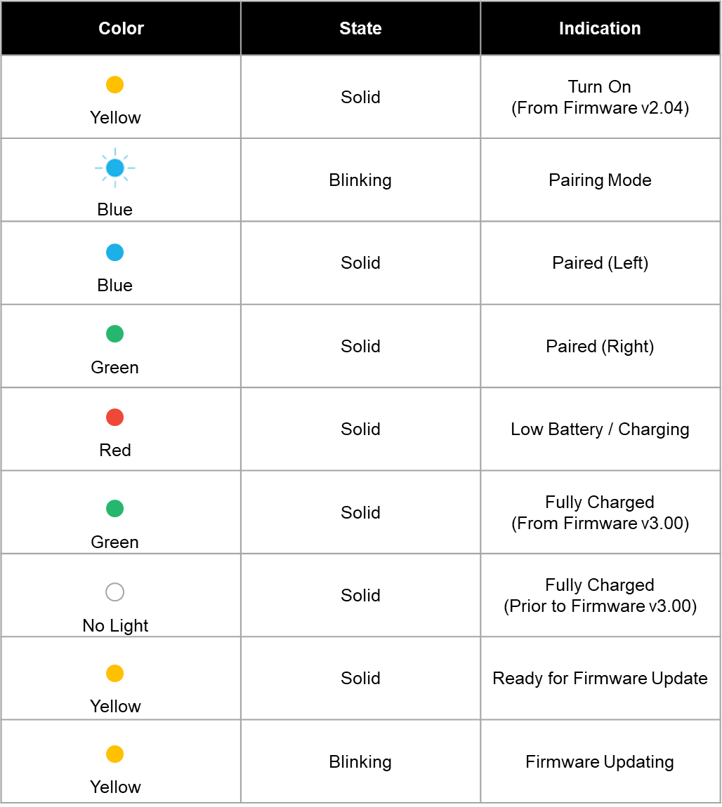 The LED indicator on the Tactosy for Arms lets you quickly check the current status. Each color and behavior of the LED light represents a specific status or function, helping you understand the device at a glance.